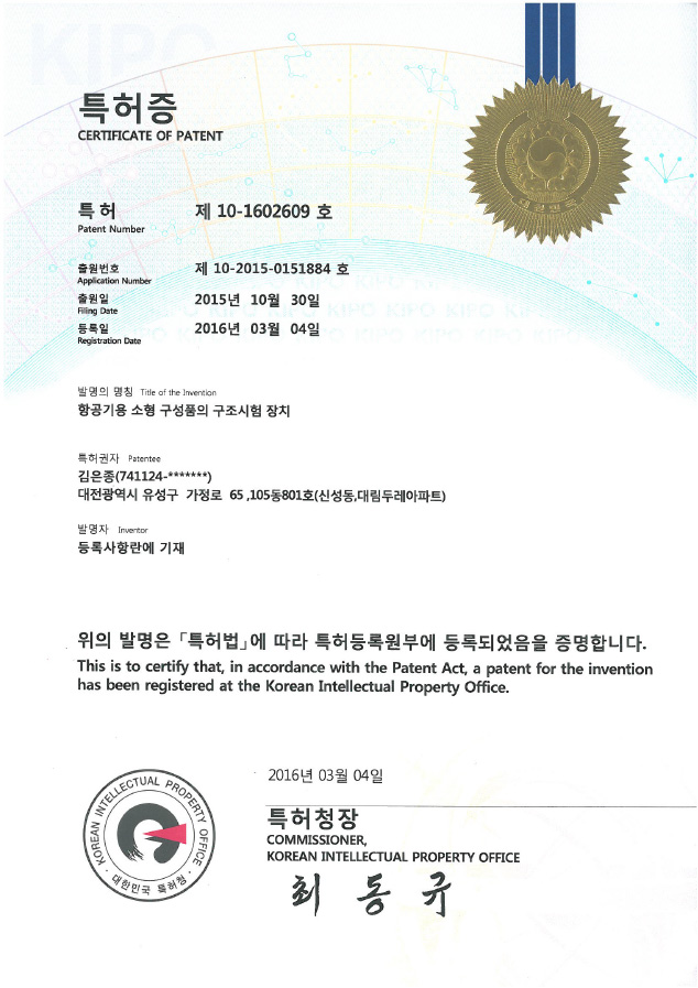 특허 (긴 날개 구조 시험 장비 및 방법)